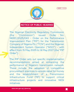 The Nigerian Electricity Regulatory Commission (the “Commission”) issued Order No. NERC/2025/043 – Order on the Performance Improvement Plan (“PIP”) for the Transmission Company of Nigeria Plc (“TCN”) and the Nigerian Independent System Operator (“NISO”) – with effect from 15 May 2025 to 14 May 2027 (the “PIP Order”).