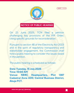NOTICE OF PUBLIC HEARING ON PETITION FILED BY THE TRANSMISSION COMPANY OF NIGERIA PLC ON THE PERFORMANCE IMPROVEMENT PLAN ORDER