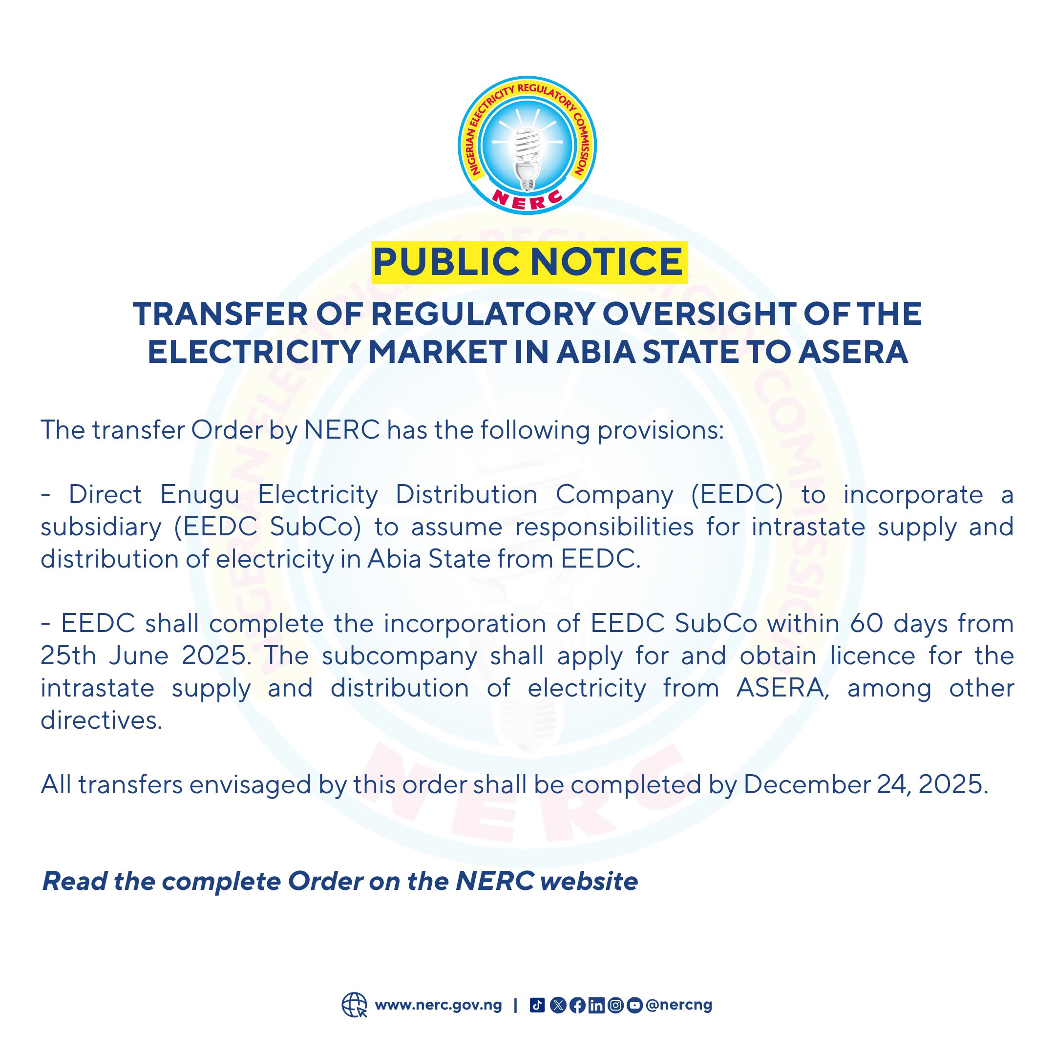 In compliance with the amended Constitution of the Federal Republic of Nigeria (CFRN) and the Electricity Act 2023 (Amended), the Nigerian Electricity Regulatory Commission ("NERC" or the "Commission" has issued an order to transfer regulatory oversight of the electricity market in Abia State from the Commission to the Abia State Electricity Regulatory Authority (ASERA).